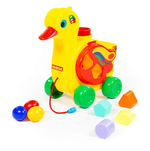 Уточка-несушка имеет яркую расцветку и объединяет в себе функции сортера и каталки. Наличие сортера позволяет ребёнку изучить форму и цвет, решая логическую задачу – подобрать отверстие для каждой фигурки. Возможность катать уточку делает игру еще интереснее, развивая при этом координацию движений малыша.