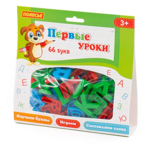 Набор букв «Первые уроки» от фабрики «Полесье» станет надёжным помощником малышам в получении знаний. Для упрощения обучения буквы выделены цветами: гласные – красным, звонкие согласные + твердый и мягкий знак – голубым, а глухие согласные – зелёным. В набор входит 66 букв: гласные – 20 шт., звонкие согласные + твердый и мягкий знак – 26 шт., глухие согласные – 20 шт. На упаковке набора «Первые уроки» предусмотрены задания, которые сделают обучение детей ещё увлекательнее.