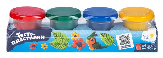 Набор из 4 цветов теста-пластилина по 50гр в баночках с крышками-штампиками.Игра с тестом-пластилином подходит для детей от 3-х лет, развивает творческие способности и воображение. Также подходит для развития мелкой моторики. Не липнет к рукам, одежде и повнрхностям, не оставляет следов и не окрашивает руки и поверхности