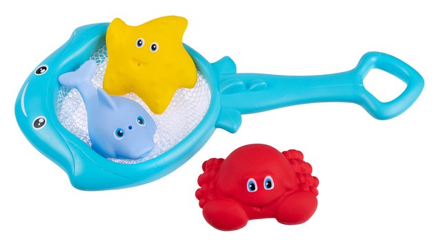 Набор игрушек для ванны, состоящий из 3 ярких игрушек, выполненных из качественного ПВХ-материала, в виде морских зверюшек (краб, морская звезда, дельфин) и сачка для их ловли. Помимо радости и веселья, такая игра способствует развитию мелкой моторики, внимания и координации ребенка, улучшает цветовое восприятие, и даже развивает логическое мышление. Индивидуальная упаковка: сетка + холдер.