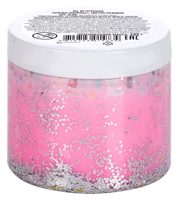 Светло-розовый зефирный слайм с серебряными блестками и цветными шариками. Номинальная масса: 145 г.