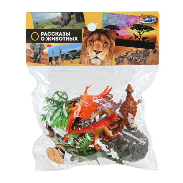 Игрушки серии «Рассказы о животных» – копии реальных рептилий, зверей, птиц и насекомых. Благодаря таким игрушкам можно легко и весело познакомить ребёнка с видами животных, их повадками и особенностями. Пластизолевыми игрушками можно играть на улице и в ванной, они легко моются. В набор «Динозавры» входят: оранжевый динозавр - 9 см, синий динозавр - 8 см, темно-зелёный динозавр - 6 см, красный динозавр - 7 см, зелёный с шипами - 6 см, чёрный динозавр - 8 см, фиолетовый с шипами - 5 см, коричневый динозавр - 7 см.