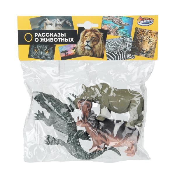 Игрушки серии «Рассказы о животных» – копии реальных зверей, птиц, рептилий и насекомых. Благодаря таким игрушкам, можно легко и весело познакомить ребёнка с представителями животного мира, их повадками и особенностями. Пластизолевыми игрушками можно играть на улице и в ванной, они не тонут в воде и легко моются. В набор «Дикие животные» входят: крокодил – 16 см, бегемот – 12 см, носорог – 10 см.