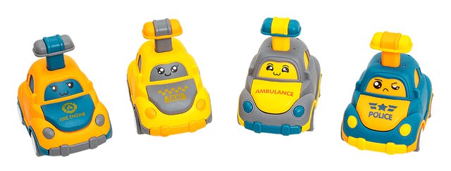Машинка инерционная с кнопкой запуска. Игрушка оснащена инерционным механизмом «нажми – поедет», который запускается нажатием кнопки на крыше машинки. У машинки открывается капот. В ассортименте 4 цвета: скорая помощь, полиция, пожарная машинка и такси. Размер машинки: 9,3*6,1*8,5 см. Поставка в дисплее по 12 шт. Размер дисплея: 24,5*28,5*8,6 см.