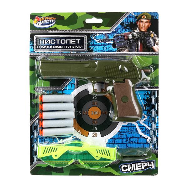 Характеристики Набор оружия ВОЕННЫЙ пистолет мягкие пули, блист.23*30*2,5см ИГРАЕМ ВМЕСТЕ в кор.2*72шт