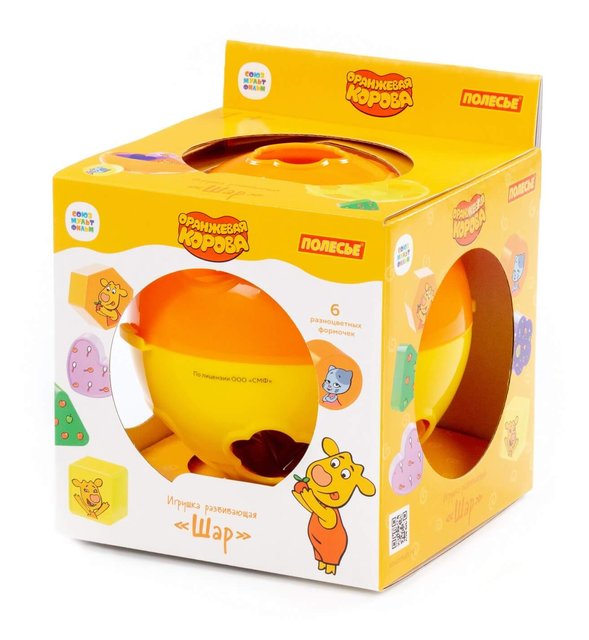 Любимые персонажи из мультсериала «Оранжевая корова» задают хорошее настроение детским играм! «Шар» «Оранжевая корова» - развивающая игрушка для детей от 1 года. На поверхности игрушки расположены отверстия разной формы, в которые нужно поместить подходящие фигурки. В комплекте 6 фигур (круг, квадрат, треугольник, многоугольник, цветочек и сердечко). Для того, чтобы достать фигурки обратно – нужно раскрыть шар. Продается игрушка в красочной коробке.