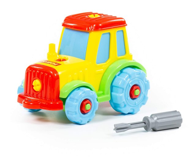 Для самых любопытных малышей, которые хотят поближе познакомиться с разными видами транспорта фабрика «Полесье» представляет — конструктор-транспорт «Трактор». Игрушка выполнена в ярких цветах, из качественного материала, имеет округлую форму. Все элементы трактора представлены в виде конструктора, который соединяется с помощью пластмассовых шурупов. В наборе также идёт крестообразная отвёртка, которая разнообразит игру, сделает её еще интереснее, позволяя без труда разбирать и собирать трактор. Игра с таким конструктором знакомит ребёнка с первыми навыками моделирования и конструирования, а также развивает фантазию. Размер в упаковке, мм: 255х115х205 (с учётом ручки-держателя)