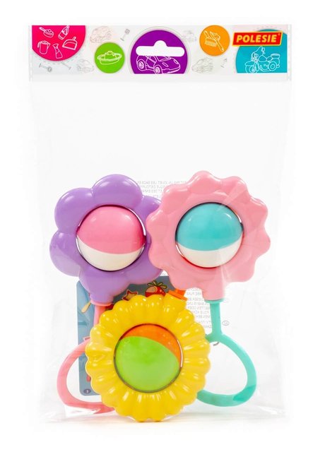 Первая игрушка в жизни малыша — погремушка. Она формирует представление ребёнка о цвете, форме, фактуре окружающих предметов. Погремушки от компании «Полесье» — прекрасные тактильные тренажёры для маленьких пальчиков ребёнка. Игрушки развивают мелкую моторику рук, знакомит с миром цветов и звуков. Погремушки выполнены в виде цветочков, и внутри содержат шарики. Игрушки безопасны для здоровья малыша, так как изготовлены из высококачественного пластика. Стоит отметить, что соединение деталей погремушек происходит путём использования ультразвукового оборудования, а не клеевых материалов.
