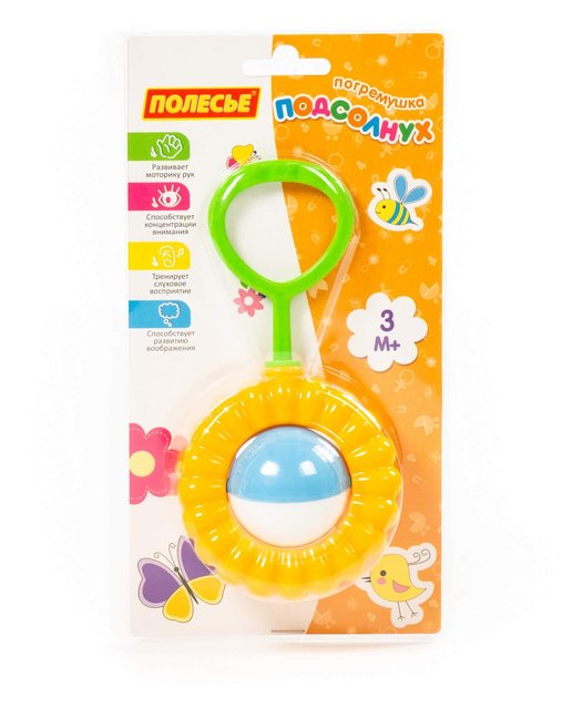 Первая игрушка в жизни малыша — погремушка. Она формирует представление ребёнка о цвете, форме, фактуре окружающих предметов. Погремушка «Подсолнух» от компании «Полесье» — прекрасно подходит для маленьких пальчиков ребёнка. Игрушка развивает мелкую моторику рук, знакомит с миром цветов и звуков. Погремушка выполнена в виде цветочка, и внутри содержит шарики. Игрушка безопасна для здоровья малыша, так как изготовлена из высококачественного пластика. Стоит отметить, что соединение деталей погремушки происходит путём использования ультразвукового оборудования, а не клеевых материалов. Вид упаковки — блистер. Возможны изменения в цветовой гамме представленных товаров.