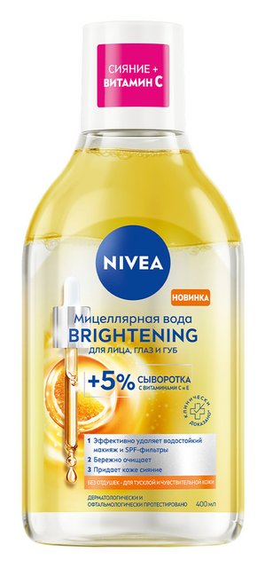 Двухфазная мицеллярная вода NIVEA BRIGHTENING для лица, глаз и губ это бережное очищение и сияние кожи в одном этапе. Формула с 5% сывороткой, витаминами C и E + аминокислотным комплексом увлажняет кожу и заряжает ее энергией, пробуждая естественное сияние. Средство эффективно удаляет до 100% макияжа всего за несколько прикосновений, включая водостойкий макияж и SPF-фильтры. Двухфазная мицеллярная вода бережно очищает кожу без трения. Подходит для тусклой и чувствительной кожи, не содержит отдушек.