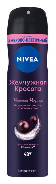 Дезодорант-антиперспирант спрей для женщин NIVEA «Жемчужная красота. Premium Perfume» и его формула с экстрактом черного жемчуга обеспечивает надёжную защиту от потоотделения и неприятного запаха на 48 часов. Антиперспирант имеет премиальный стойкий амброво-цветочный аромат. Для гладкой и сияющей кожи подмышек. Слишком красивых, чтобы их прятать! Дезодорант-антиперспирант быстро высыхает и защищает от неприятного запаха на 48 часов. Без ощущения липкости на коже. Дерматологически протестировано. Уже более 100 лет NIVEA создает особенно бережные для кожи формулы. Попробуй нежный уход за кожей от антиперспиранта NIVEA без этилового спирта!